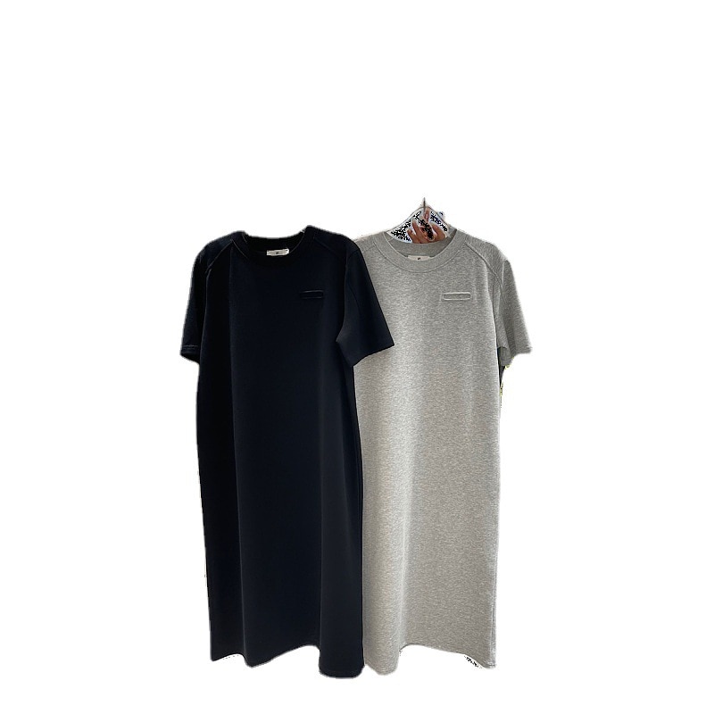 The new 2023 cotton round collar fake pocket long over-the-knee T-shirt female summer dress
